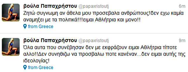 «Ζητώ συγγνώμη αν άθελα μου προσέβαλα ανθρώπους! δεν έχω καμία ανάμειξη με τα πολιτικά!!! Είμαι Αθλήτρια και μόνο!! Όλα αυτά που συνέβησαν δεν με εκφράζουν είμαι Αθλήτρια τίποτε άλλο!! Δεν συνηθίζω να προσβάλω ποτέ κανέναν… δεν είμαι αυτής της ιδεολογίας!»