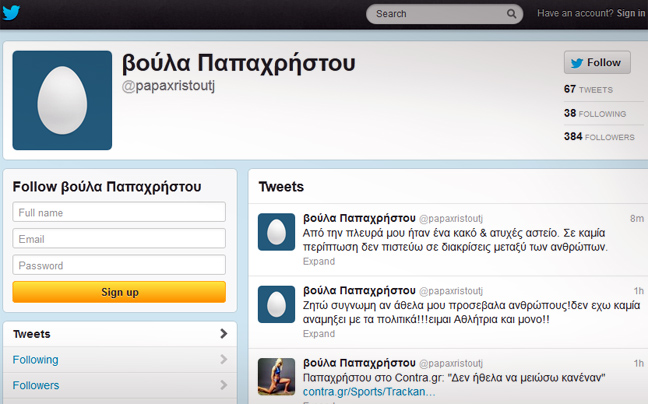 Τον λογαριασμό της στο twitter άνοιξε μέσα σε λίγα λεπτά η πρωταθλήτρια του τριπλούν, Βούλα Παπαχρήστου. Παρά το σάλο που έχει ξεσπάσει γύρω από τα σχόλιά της, εκείνη ζήτησε δημόσια συγγνώμη, αναφέροντας χαρακτηριστικά: