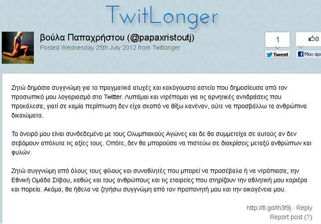 «Ζητώ δημόσια συγγνώμη για το πραγματικά ατυχές και κακόγουστο αστείο που δημοσίευσα από τον προσωπικό μου λογαριασμό στο Twitter. Λυπάμαι και ντρέπομαι για τις αρνητικές αντιδράσεις που προκάλεσα, γιατί σε καμία περίπτωση δεν είχα σκοπό να θίξω κανέναν, ούτε να προσβάλλω τα ανθρώπινα δικαιώματα.