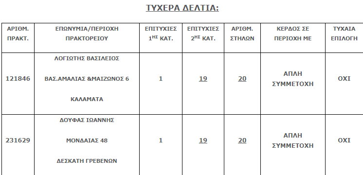Δύο υπερτυχερούς, που μοιράζονται περίπου 9,2 εκατ. ευρώ, κερδίζοντας ο καθένας περισσότερα από 4,6 εκατ. ευρώ, ανέδειξε η κλήρωση του Τζόκερ το βράδυ της Κυριακής. Πρόκειται για δύο δελτία που κερδίζουν το ποσό των 4.588.897,01 εκατ. ευρώ έκαστο και τα οποία φέρουν από 19 επιτυχίες στη δεύτερη κατηγορία (5) όπου η κάθε επιτυχία κερδίζει από 4.624,80 ευρώ. Επίσης, οκτώ ακόμη τυχερά δελτία βρέθηκαν στην 2η κατηγορία (5), εκ των οποίων το ένα φέρει 2 επιτυχίες, και τα οποία για κάθε επιτυχία κερδίζουν το ποσό των 4.624,80 ευρώ. Το ένα δελτίο που κερδίζει περισσότερα από 4,6 εκατ. ευρώ παίχτηκε στη Δεσκάτη Γρεβενών. Ήταν απλή συμμετοχή και κόστισε 10 ευρώ. Το δεύτερο δελτίο παίχτηκε στην Καλαμάτα. Ήταν επίσης απλή συμμετοχή και κόστισε 10 ευρώ. Οι τυχεροί αριθμοί του Τζόκερ: 5, 13, 21, 31, 34 Τζόκερ: 5