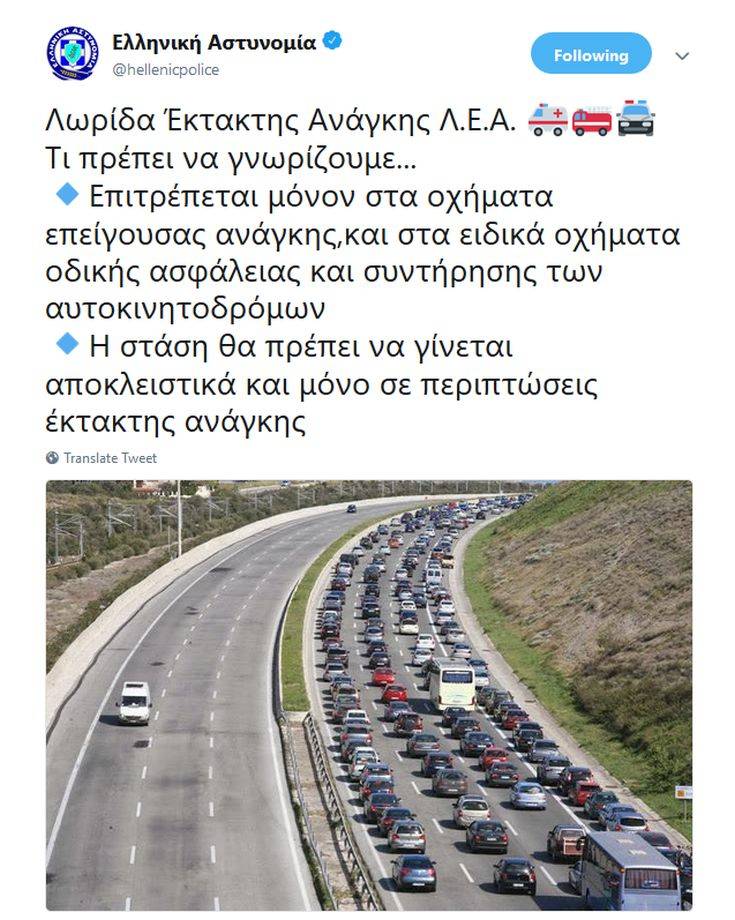 Με ένα μήνυμά της στον επίσημο λογαριασμό της στο Twitter, η Ελληνική Αστυνομία υπενθυμίζει στους οδηγούς τι πρέπει να γνωρίζουν για τη Λωρίδα Έκτακτης Ανάγκης. Ειδικότερα, γράφει η ΕΛΑΣ: «Λωρίδα Έκτακτης Ανάγκης Λ.Ε.Α. Τι πρέπει να γνωρίζουμε… Επιτρέπεται μόνον στα οχήματα επείγουσας ανάγκης, και στα ειδικά οχήματα οδικής ασφάλειας και συντήρησης των αυτοκινητοδρόμων Η στάση θα πρέπει να γίνεται αποκλειστικά και μόνο σε περιπτώσεις έκτακτης ανάγκης».