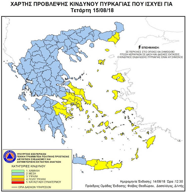 Πολύ υψηλός είναι ο κίνδυνος πυρκαγιάς (κατηγορία κινδύνου 4) για αύριο, Τετάρτη 15 Αυγούστου 2018, σε Αττική και Εύβοια, σύμφωνα με τον Χάρτη Πρόβλεψης Κινδύνου Πυρκαγιάς της Γενικής Γραμματείας Πολιτικής Προστασίας του υπουργείου Εσωτερικών.