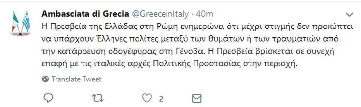 Μέχρι στιγμής δεν προκύπτει να υπάρχουν Έλληνες πολίτες μεταξύ των θυμάτων ή των τραυματιών από την κατάρρευση οδογέφυρας στη Γένοβα, σύμφωνα με την ελληνική πρεσβεία στη Ρώμη. Ειδικότερα, σε μήνυμα της πρεσβείας που αναρτήθηκε στο Twitter σημειώνεται: «Η Πρεσβεία της Ελλάδας στη Ρώμη ενημερώνει ότι μέχρι στιγμής δεν προκύπτει να υπάρχουν Έλληνες πολίτες μεταξύ των θυμάτων ή των τραυματιών από την κατάρρευση οδογέφυρας στη Γένοβα. Η Πρεσβεία βρίσκεται σε συνεχή επαφή με τις ιταλικές αρχές Πολιτικής Προστασίας στην περιοχή».