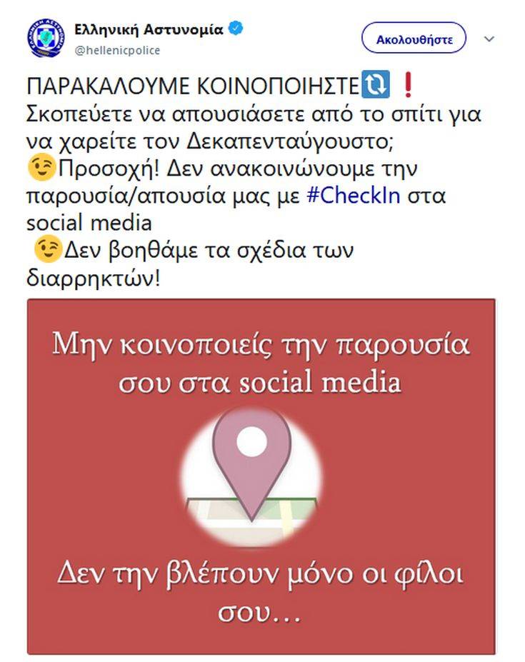 «Μην κοινοποιείς την παρουσία σου στα social media, μπορεί να μην την βλέπουν μόνο οι φίλοι σου» αναφέρει στο twitter η ΕΛ.ΑΣ.
