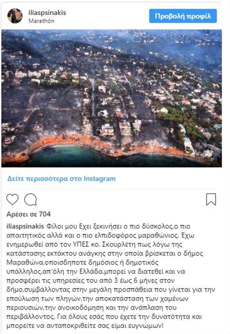 Μήνυμα προς όσους δημόσιους και δημοτικούς υπαλλήλους το επιθυμούν να βοηθήσουν στην επούλωση των πληγών στο δήμο Μαραθώνα μετά την καταστροφική πυρκαγιά έστειλε μέσω Instagram ο δήμαρχος Μαραθώνα Ηλίας Ψινάκης. Στην ανάρτησή του, ο κ. Ψινάκης αναφέρει ότι έχει ξεκινήσει «ο πιο δύσκολος, ο πιο απαιτητικός, αλλά και ο πιο ελπιδοφόρος μαραθώνιος», και εξηγεί πως, σύμφωνα με σχετική ενημέρωση από τον υπουργό Εσωτερικών Πάνο Σκουρλέτη, λόγω της κατάστασης εκτάκτου ανάγκης στην οποία βρίσκεται ο δήμος Μαραθώνα, οποισδήποτε δημόσιος ή δημοτικός υπάλληλος, από όλη την Ελλάδα, μπορεί να διατεθεί και να προσφέρει τις υπηρεσίες του από 3 έως 6 μήνες στον δήμο, «συμβάλλοντας στην μεγάλη προσπάθεια που γίνεται για την επούλωση των πληγών, την αποκατάσταση των χαμένων περιουσιών, την ανοικοδόμηση και την ανάπλαση του περιβάλλοντος». «Για όλους εσάς που έχετε την δυνατότητα και μπορείτε να ανταποκριθείτε σας είμαι ευγνώμων!», καταλήγει ο δήμαρχος Μαραθώνα.