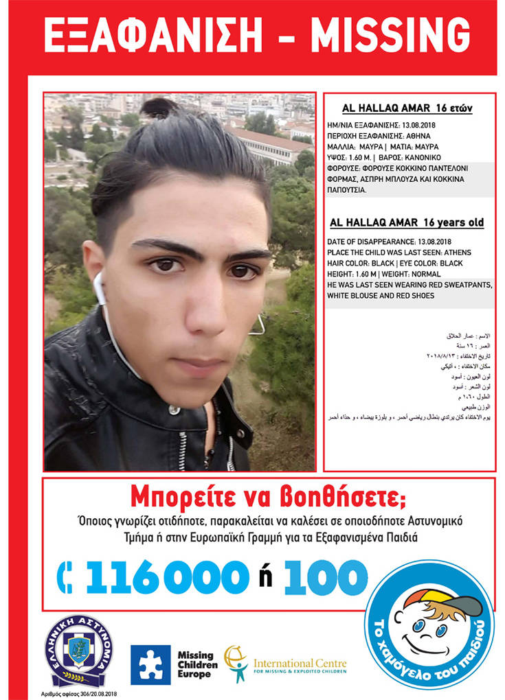 Συγκεκριμένα, στις 13/08, στις 20:00 εξαφανίστηκε από την περιοχή της Αθήνας, ο Amar (ον.) Al Hallaq (επ.), 16 ετών, συριακής καταγωγής. Για την εν λόγω εξαφάνιση, «Το Χαμόγελο του Παιδιού» ενημερώθηκε στις 20/08/2018 και προχώρησε άμεσα στη δημοσιοποίηση των στοιχείων του παιδιού.