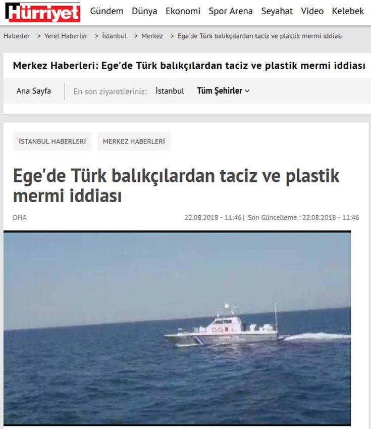 Δηλώσεις Τούρκων ψαράδων, σύμφωνα με τις οποίες Έλληνες λιμενικοί τους πυροβόλησαν, σπάζοντας μάλιστα και τζάμι του αλιευτικού τους, ενώ βρίσκονταν στα διεθνή ύδατα, ανοιχτά της Σάμου, δημοσιεύει η τουρκική εφημερίδα Hurriyet.