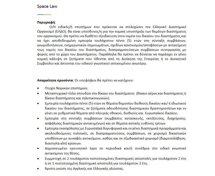 Επιστημονικό προσωπικό αναζητά ο Ελληνικός Διαστημικός Οργανισμός. Ανάμεσα στις ειδικότητες που ψάχνει ο ΕΛΔΟ είναι και εκείνη ενός επιστήμονα-νομικού συμβούλου σε θέματα Διαστημικού Δικαίου (Space Law). «Ο/Η ειδικός/ή επιστήμων που πρόκειται να στελεχώσει τον Ελληνικό Διαστημικό Οργανισμό (ΕΛΔΟ), θα είναι υπεύθυνος/η για την νομική υποστήριξη των θεμάτων διαστήματος του οργανισμού. Θα πρέπει να διαθέτει εξειδίκευση στον τομέα του δικαίου του διαστήματος και να έχει αποδεδειγμένη εμπειρία τουλάχιστον πέντε (5) ετών στη σύνταξη συμβάσεων, γνωμοδοτήσεων, ενημερωτικών σημειωμάτων, σχεδίων κανονισμών/αποφάσεων με αντικείμενο τους τομείς του δικαίου του διαστήματος, διαπραγματεύσεων συμβάσεων συνεργασίας με φορείς από το χώρο του Διαστήματος. Παράλληλα θα πρέπει να δύναται να παράσχει εν γένει νομική κάλυψη σε ζητήματα που τίθενται από τη Διοίκηση της Εταιρείας ή το Διοικητικό Συμβούλιο και άπτονται του ειδικού γνωστικού αντικειμένου ανωτέρω», αναφέρεται στην περιγραφή της θέσης. Ανάμεσα στα προσόντα που απαιτούνται για τη θέση είναι και το εξής: «Συμμετοχή σε 2 τουλάχιστον πιστοποιημένες διαστημικές αποστολές για τουλάχιστον 2 έτη ή σε 1 πιστοποιημένη διαστημική αποστολή για τουλάχιστον 3 έτη».