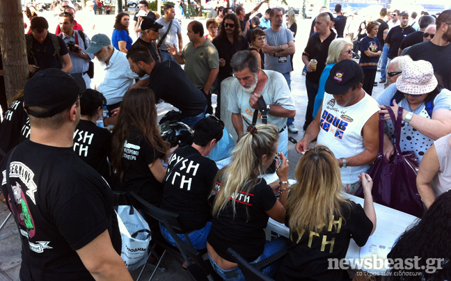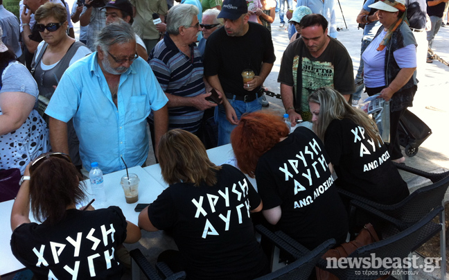 Μέλη της Χρυσής Αυγής κρατούν τα στοιχεία των ανθρώπων που φθάνουν στο Σύνταγμα για να προμηθευτούν δωρεάν τρόφιμα