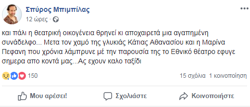 Ο γνωστός ηθοποιός έγραψε στην ανάρτησή του: «Και πάλι η θεατρική οικογένεια θρηνεί κι αποχαιρετά μια αγαπημένη συνάδελφο. Μετά τον χαμό της γλυκιάς Κάτιας Αθανασίου και η Μαρίνα Πεφάνη που χρόνια λάμπρυνε με την παρουσία της το Εθνικό θέατρο, έφυγε σήμερα από κοντά μας. Ας έχουν καλό ταξίδι».
