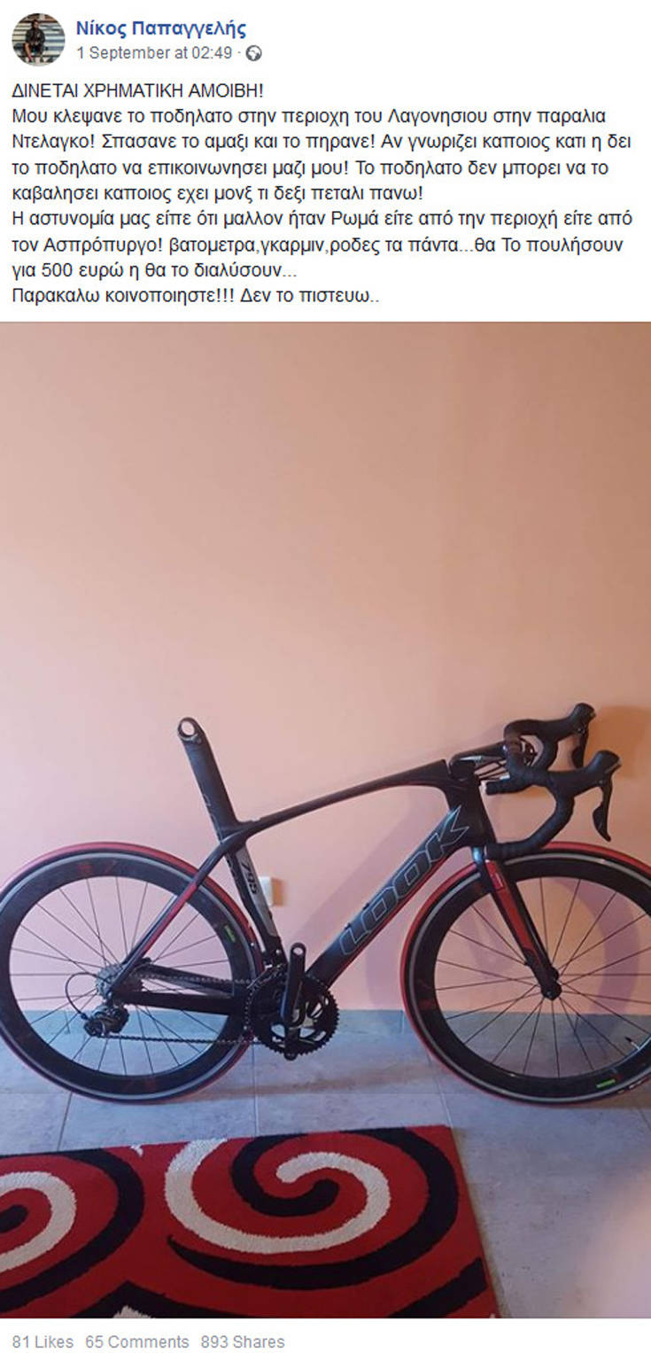 Το γεγονός αυτό κάνει σαφώς πιο δύσκολη την προσπάθεια του Παπαγγελή για συμμετοχή στους Παραολυμπιακούς αγώνες του 2020. «Το ποδήλατο δεν μπορεί να το καβαλήσει κάποιος, έχει μόνο το δεξί πετάλι πάνω», διευκρινίζει ο ίδιος με ποστ απόγνωσης στο Facebook, μέσω του οποίου τονίζει ότι προσφέρει αμοιβή σε όποιον τον βοηθήσει να το βρει.