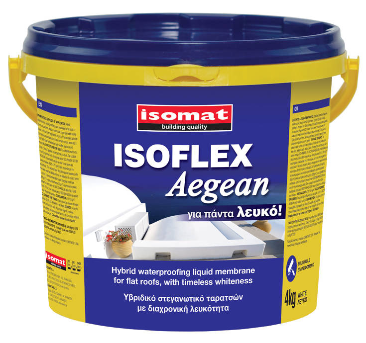 Το ISOFLEX AEGEAN είναι ένα υβριδικό επαλειφόμενο, ελαστομερές στεγανωτικό ταρατσών με διαχρονική υψηλή λευκότητα. Αποτελεί όχι μόνο μία αποτελεσματική λύση στεγάνωσης της ταράτσας ή του μπαλκονιού σας, αλλά σας βοηθάει και να εξοικονομήσετε ενέργεια τους καυτούς καλοκαιρινούς μήνες. Χάρη στην υψηλή του λευκότητα, που διατηρείται αναλλοίωτη για πολλά χρόνια, έχει μεγάλη ηλιακή ανακλαστικότητα, μειώνοντας έτσι τη θερμοκρασία στην επιφάνεια της ταράτσας. Κατά συνέπεια, μειώνεται έτσι και η ανάγκη χρήσης κλιματισμού. Με το προϊόν αυτό λοιπόν, μειώνονται τόσο τα έξοδα συντήρησης της στεγανωτικής σας στρώσης, καθώς διαρκεί για πολλά χρόνια με την ίδια λευκότητα, όσο και τα λειτουργικά σας έξοδα για ψύξη του κτιρίου σας. Για το λόγο αυτό, το ISOFLEX AEGEAN μπορεί να χρησιμοποιηθεί και σαν ψυχρή βαφή ταρατσών, ενώ είναι πιστοποιημένο με τη σήμανση CE, ως προϊόν προστασίας επιφανειών σκυροδέματος.
