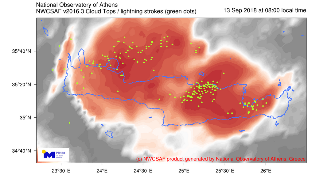 Μεγάλα ύψη βροχής σημειώνονται από το πρωί στην Κρήτη αλλά και στην Εύβοια, καθώς άλλαξε ο καιρός. Ο πίνακας που ακολουθεί δίνει τα οκτώ μεγαλύτερα ύψη βροχής που έχουν καταγράψει οι σταθμοί του Εθνικού Αστεροσκοπείου μέχρι τις 8 το πρωί της Πέμπτης. Σήμερα οι άνεμοι στο Βόρειο Αιγαίο θα πνέουν από βορειοανατολικές διευθύνσεις ισχυροί έως σχεδόν θυελλώδεις 6 με 7 μποφόρ και στο υπόλοιπο Αιγαίο βόρειοι βορειοδυτικοί με ίδιες εντάσεις και σταδιακή μικρή εξασθένηση σε όλες τις περιοχές από τις απογευματινές ώρες. Τοπικές νεφώσεις αναμένονται σε ολόκληρη τη χώρα, πυκνότερες στα ανατολικά και νότια ηπειρωτικά και στο Αιγαίο όπου κατά περιόδους θα εκδηλώνονται βροχές και σποραδικές καταιγίδες. Τα φαινόμενα ενδέχεται να είναι τοπικά έντονα, κυρίως στην Ανατολική Θεσσαλία, στην Εύβοια, στις Σποράδες, στη Βοιωτία, στις Κυκλάδες και στη Βόρεια Κρήτη. Από το πρωί της Πέμπτης σημειώνονται ισχυρές βροχές στην Κρήτη και στην Εύβοια μεταξύ άλλων. Συγκεκριμένα το πρωί στο επίκεντρο βρίσκονται τα Χανιά, το Ηράκλειο, το Ρέθυμνο, η Χαλκίδα, η Στενή Ευβοίας αλλά και η Σκόπελος. Η παρακάτω εικόνα δίνει τα νέφη (κόκκινες αποχρώσεις) όπως αποτυπώνονται από το δορυφόρο ΜΕΤΕΟSAT και τους κεραυνούς.
