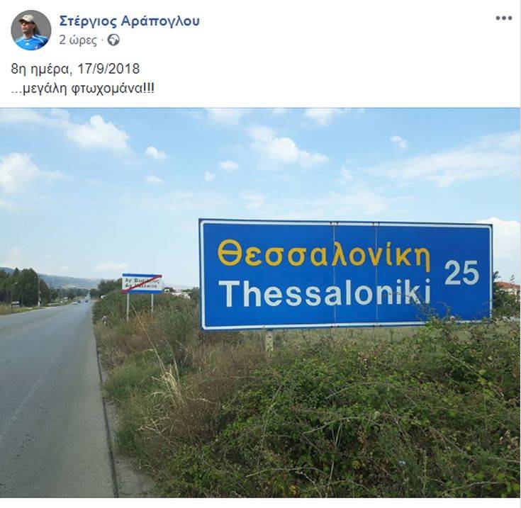 Με στόχο να δώσει ένα μήνυμα υπέρ της πρόληψης των τροχαίων ατυχημάτων/δυστυχημάτων και υπέρ του καθαρού αθλητισμού, ο Θεσσαλονικιός χειρουργός, Στέργιος Αράπογλου, με την υποστήριξη της ΧΑΝΘ, ξεκίνησε στις 10 Σεπτεμβρίου από το Ορμένιο του Έβρου να περπατήσει 1.400 χιλιόμετρα και αφού περάσει από 293 πόλεις, κωμοπόλεις, χωριά και διάφορους οικισμούς να φτάσει στις 3 Οκτωβρίου στο Ακρωτήριο Ταίναρον. Σύμφωνα με στοιχεία της Διεύθυνσης Τροχαίας Θεσσαλονίκης σχετικά με τα θανατηφόρα τροχαία ατυχήματα στον νομό, κατά το πρώτο εξάμηνο του 2018, το 47,37% αφορούσε παρασύρσεις πεζών, το 31,58% συγκρούσεις οχημάτων και το 21,05% εκτροπές. Τα στοιχεία του πρώτου εξαμήνου σχετικά με τα σοβαρά -αλλά όχι θανατηφόρα- τροχαία ατυχήματα, δείχνουν ότι το 44,44% ήταν παρασύρσεις πεζών, το 33,33% σε εκτροπές οχημάτων οχημάτων, το 16,67% συγκρούσεις κινούμενων και το 5,56% πρόσκρουση οχήματος. Εξάλλου, σύμφωνα με στοιχεία της Ελληνικής Στατιστικής Αρχής, μόνο για τον Ιούνιο του 2018, τα οδικά τροχαία ατυχήματα που συνέβησαν σε ολόκληρη τη χώρα και προκάλεσαν τον θάνατο ή τον τραυματισμό ατόμων ανέρχονται σε 944.