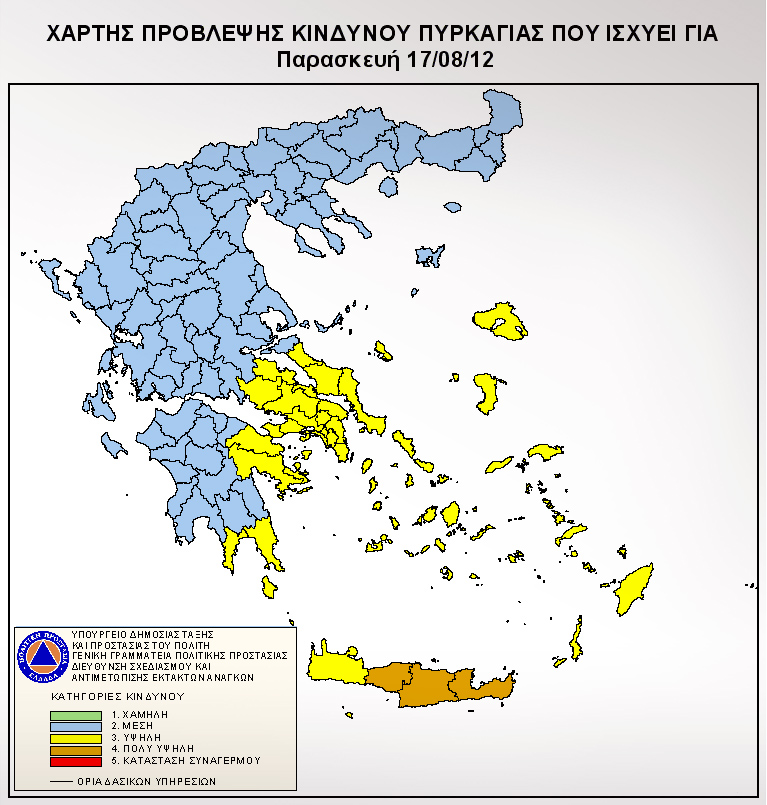 Πολύ υψηλός κίνδυνος υπάρχει σήμερα σύμφωνα με το Χάρτη Πρόβλεψης Κινδύνου Πυρκαγιάς που εκδίδει η Γενική Γραμματεία Πολιτικής Προστασίας.