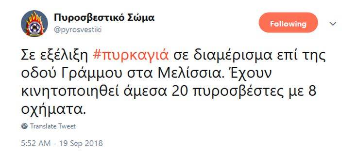 Συναγερμός σήμανε νωρίς το απόγευμα της τετάρτης στην Πυροσβεστική λόγω πυρκαγιάς που ξέσπασε σε διαμέρισμα επί της οδού Γράμμου στα Μελίσσια.