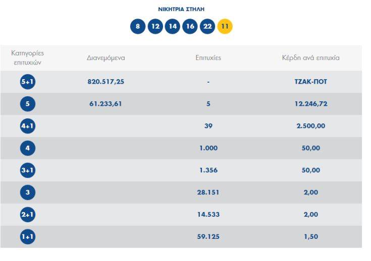 Οι τυχεροί αριθμοί του ΤΖΟΚΕΡ: 8, 12, 14, 16, 22 ΤΖΟΚΕΡ: 11