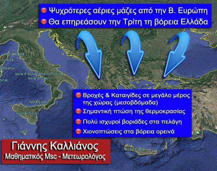 Περίπου από τα μέσα της ερχόμενης εβδομάδας, φαίνεται ότι ψυχρότερες αέριες μάζες από τη βόρεια Ευρώπη θα εισέλθουν και στις υπόλοιπες περιοχές της χώρας, με αποτέλεσμα ο καιρός να καταστεί ακόμη και χειμωνιάτικος κυρίως στις πιο ορεινές περιοχές και ιδιαίτερα στη βόρεια Ελλάδα. Σύμφωνα πάντα με τα τελευταία προγνωστικά στοιχεία, την ερχόμενη Τετάρτη θα επικρατήσουν ισχυροί βοριάδες που θα ρίξουν κατακόρυφα τον υδράργυρο, θα εκδηλώνονται κατά διαστήματα βροχές και καταιγίδες στο μεγαλύτερο μέρος της χώρας, ενώ δεν αποκλείεται να εκδηλωθούν και οι πρώτες χιονοπτώσεις για το φετινό φθινόπωρο στις ορεινές περιοχές της βόρειας Ελλάδας.