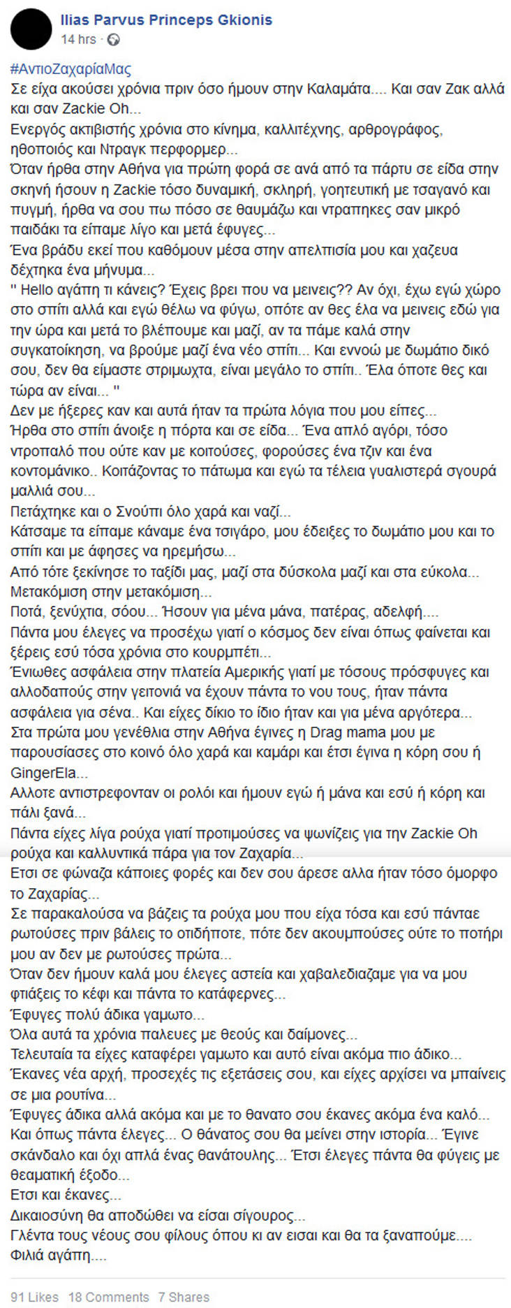 Με μια ανάρτηση στο Facebook αποχαιρετά τον Ζακ Κωστόπουλο, τον νεαρό άνδρα που έχασε τη ζωή του μετά το περιστατικό στο κοσμηματοπωλείο στην Ομόνοια την περασμένη Παρασκευή, ο συγκάτοικός του. Στο κείμενό του θυμάται πώς συναντήθηκαν για πρώτη φορά, πώς αποφάσισαν να συγκατοικήσουν ενώ μοιράζεται και στιγμές που έζησαν μαζί. «Έφυγες πολύ άδικα γαμωτο… Όλα αυτά τα χρόνια παλευες με θεούς και δαίμονες… Τελευταία τα είχες καταφέρει γαμώτο και αυτό είναι ακόμα πιο άδικο… Έκανες νέα αρχή, προσεχές τις εξετάσεις σου, και είχες αρχίσει να μπαίνεις σε μια ρουτίνα… Έφυγες άδικα αλλά ακόμα και με το θάνατο σου έκανες ακόμα ένα καλό… Και όπως πάντα έλεγες… Ο θάνατος σου θα μείνει στην ιστορία… Έγινε σκάνδαλο και όχι απλά ένας θανάτουλης… Έτσι έλεγες πάντα θα φύγεις με θεαματική έξοδο… Έτσι και έκανες… Δικαιοσύνη θα αποδοθεί να είσαι σίγουρος…» καταλήγει στο κείμενό του.
