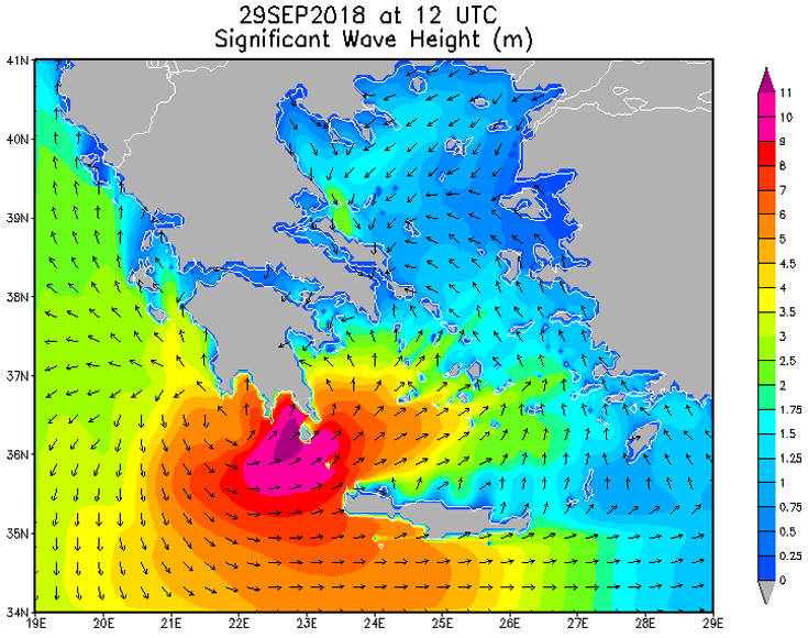 Το παρακάτω animation δείχνει την προβλεπόμενη θέση του μεσογειακού κυκλώνα «Ξενοφών» νότια της Πελοποννήσου το απόγευμα του Σαββάτου 29/09 στις 15:00. Οι άνεμοι στη θάλασσα των Κυθήρων αναμένεται να ξεπεράσουν σε ένταση τα 9 μποφόρ.