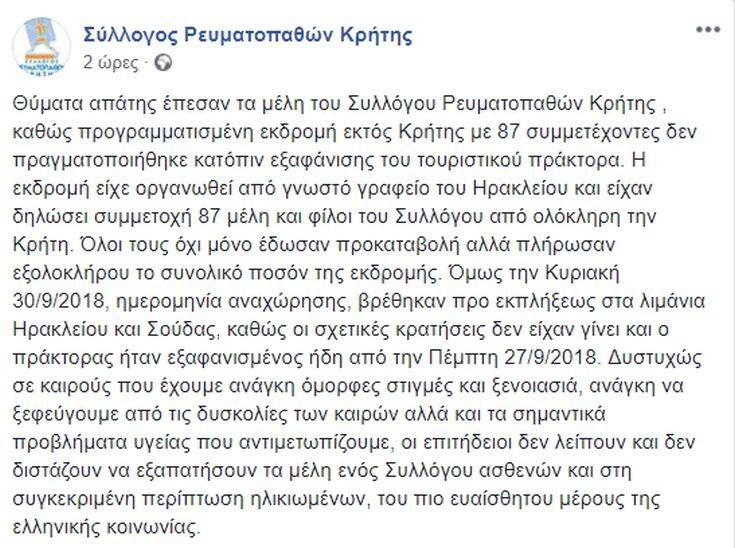 Ένα σοβαρό περιστατικό με «πρωταγωνιστή» τουριστικό πράκτορα από την Αθήνα και θύματα 87 άτομα από όλη την Κρήτη καταγγέλλει ο Σύλλογος Ρευματοπαθών του νησιού. Του ανταποκριτή μας από το flashnews.gr στην Κρήτη Σύμφωνα με την καταγγελία και πληροφορίες που επικαλείται το Flashnews.gr, ο σύλλογος είχε διοργανώσει την καθιερωμένη ετήσια εκδρομή εκτός Κρήτης -και συγκεκριμένα στο Μεσολόγγι- συνδυάζοντας το ταξίδι με λουτροθεραπείες. Στην εκδρομή είχαν δηλώσει συμμετοχή 87 μέλη και φίλοι του Συλλόγου, προπληρώνοντας εξολοκλήρου το συνολικό ποσό της εκδρομής. Την Κυριακή, που ήταν προγραμματισμένη η αναχώρηση από τα λιμάνια των Χανίων και του Ηρακλείου, οι συμμετέχοντες βρέθηκαν προ εκπλήξεως καθώς πληροφορήθηκαν ότι οι σχετικές κρατήσεις δεν είχαν γίνει και ο πράκτορας ήταν εξαφανισμένος. Κάθε προσπάθεια μελών του Συλλόγου να επικοινωνήσουν με τον πράκτορα – «φάντασμα» έπεσε στο κενό, καθώς το κινητό τηλέφωνο που είχε θέσει στη διάθεση των εκδρομέων για επικοινωνία, ήταν διαρκώς απενεργοποιημένο. Σύμφωνα με πληροφορίες του Flashnews.gr ο συγκεκριμένος πράκτορας ισχυρίστηκε ότι είχε γραφείο στην Αθήνα, ενώ την υπόθεση ερευνούν οι αστυνομικές Αρχές στην πρωτεύουσα όσο και στο Ηράκλειο. Δείτε την ανάρτηση του συλλόγου στο Facebook: