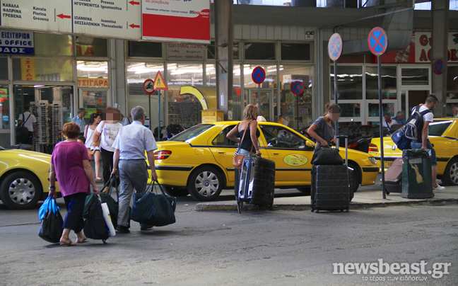 Αυτοκινητιστές περιμένουν την ώρα που τα λεωφορεία θα φτάσουν και θα αποβιβάσουν κόσμο. Στέκονται στα σημεία στα οποία παρκάρουν οι οδηγοί των ΚΤΕΛ προσπαθώντας να βρουν πελάτες.