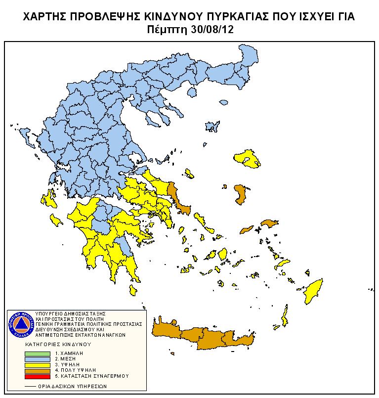 Σύμφωνα με το Χάρτη Πρόβλεψης Κινδύνου Πυρκαγιάς που εκδίδει η Γενική Γραμματεία Πολιτικής Προστασίας προβλέπεται πολύ υψηλός κίνδυνος πυρκαγιάς (κατηγορία κινδύνου 4) για τις ακόλουθες περιοχές: