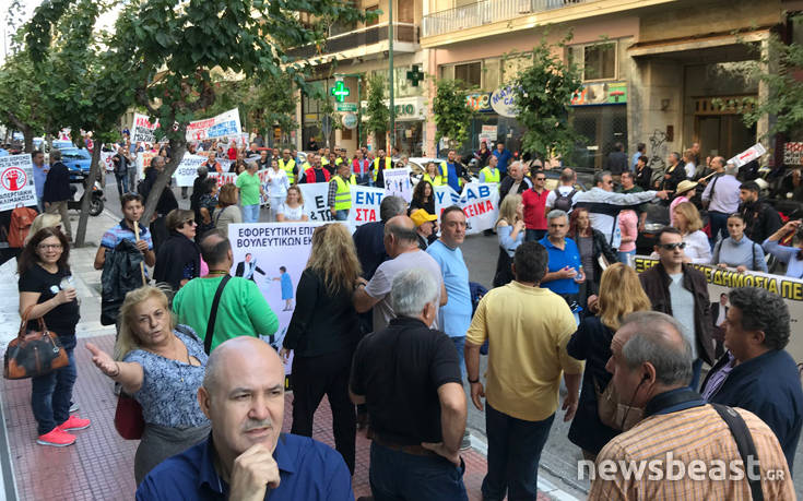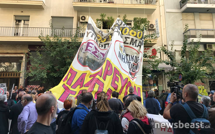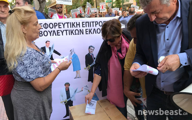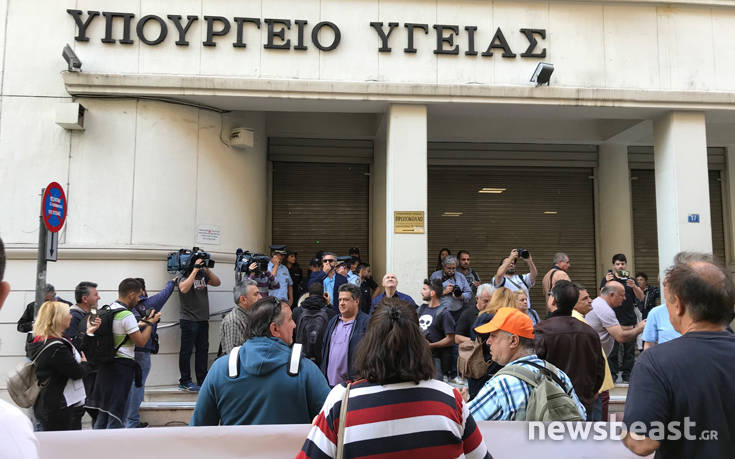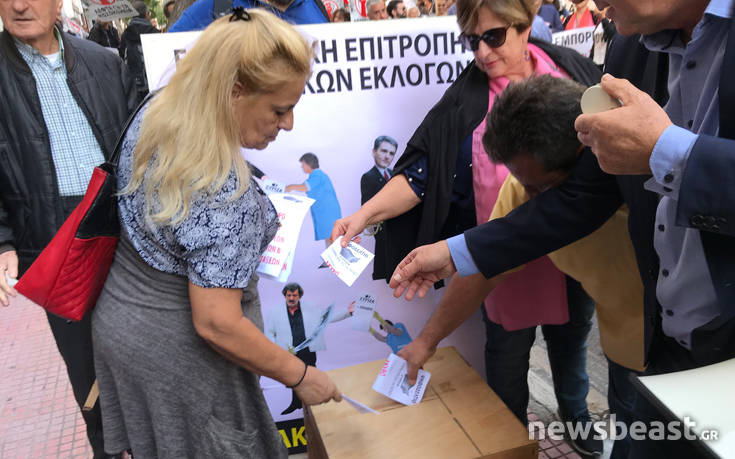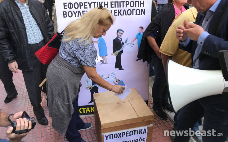 Στο υπουργείο Υγείας έφτασε η πορεία της ΠΟΕΔΗΝ. Οι εργαζόμενοι στα νοσοκομεία έστησαν μία κάλπη έξω από το υπουργείο η οποία γράφει «υποχρεωτικά ένας σταυρός στο ΣΥΡΙΖΑ».