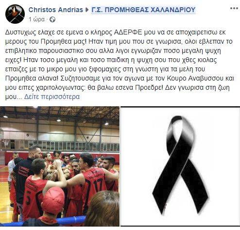 Την είδηση του θανάτου για τον πρώην σέντερ του Πανελληνίου, του Ψυχικού, της Νίκης Αμαρουσίου, του Χαλανδρίου, του Σπόρτιγκ, του Αλίμου, της Ξάνθης, του Ίκαρου Καλλιθέας και του Έσπερου, έκανε γνωστή ο πρόεδρος του Προμηθέα Χαλανδρίου, Χρήστος Ανδριάς, μέσω Facebook.