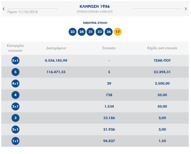 Οι τυχεροί αριθμοί του ΤΖΟΚΕΡ: 23, 24, 31, 33, 36 ΤΖΟΚΕΡ: 17
