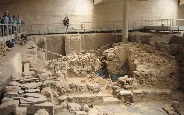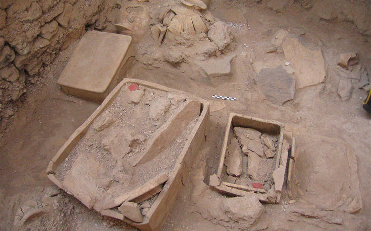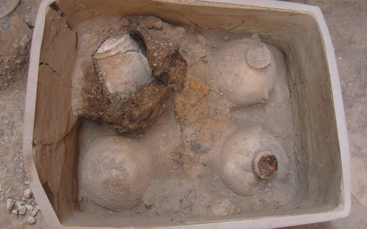 Συγκεκριμένα, όπως ενημερώνει με ανακοίνωσή του το υπουργείο Πολιτισμού και Αθλητισμού, «σε εσωτερικό χώρο σημαντικού κτηρίου, πιθανότατα δημόσιου χαρακτήρα, γνωστού με το συμβατικό όνομα “Οικία των Θρανίων” όπου το 1999 είχε βρεθεί ο περίφημος χρυσός αίγαγρος που εκτίθεται στο Μουσείο Προϊστορικής Θήρας, τοποθετημένος σε πήλινη λάρνακα, δίπλα σε σωρό κεράτων ζώων, βρέθηκαν εφέτος, κάτω από τις επιχώσεις καταστροφής, με χρονολογική ακολουθία, αρχικά αμφορείς και στη συνέχεια μικρές ορθογώνιες πήλινες λάρνακες».