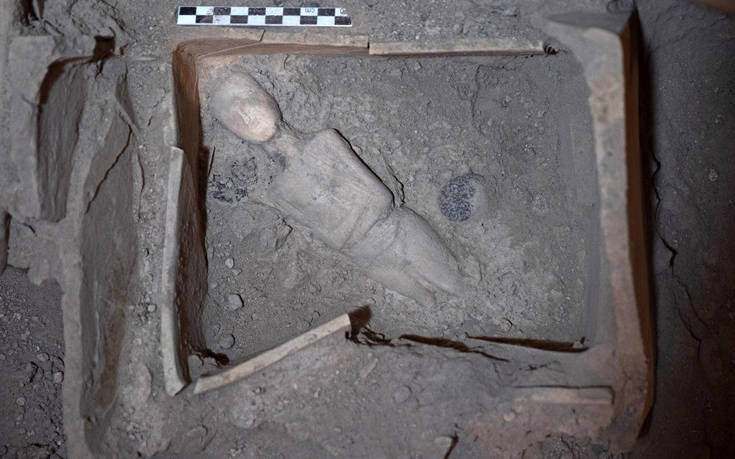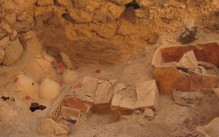 «Μετά την σταδιακή αποκάλυψη και τον καθαρισμό μικρής λάρνακας στη ΒΔ γωνία του χώρου βρέθηκε μαρμάρινο πρωτοκυκλαδικό γυναικείο ειδώλιο τοποθετημένο διαγώνια στον πυθμένα του σκεύους. Από την ομάδα λαρνάκων της ΝΑ γωνίας του χώρου αποκαλύφθηκαν τρεις, από τις οποίες οι δύο μικρότερες περιείχαν μάζα πηλού σε ωοειδή διαμόρφωση, ενώ στη μεγαλύτερη είχαν τοποθετηθεί ανεστραμμένοι δύο μαρμάρινοι πρωτοκυκλαδικοί κρατηρίσκοι, μια μαρμάρινη φιάλη και ένα αγγείο αλαβάστρινο» συνεχίζει η ανακοίνωση του ΥΠΠΟΑ.