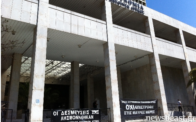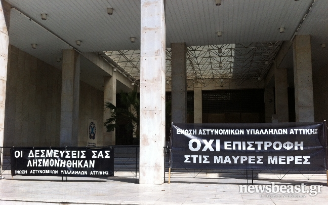 Με δύο μαύρα πανό που έχουν κρεμάσει μπροστά από την ΓΑΔΑ οι αστυνομικοί της ΕΑΣΥΑ διαμαρτύρονται για τις περικοπές στους μισθούς τους.