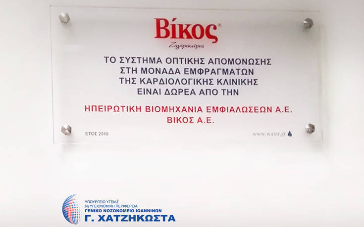 Η Ηπειρωτική Βιομηχανία Εμφιαλώσεων ΒΙΚΟΣ Α.Ε. αναγνωρίζοντας το υψηλό ιατρικό και νοσηλευτικό έργο που επιτελεί το Γενικό Νοσοκομείο Ιωαννίνων «Γ. Χατζηκώστα», αλλά και ανταποκρινόμενη στην ανάγκη να συνεχίσει να παρέχει υψηλού επιπέδου Υγειονομική Φροντίδα στους πολίτες της Ηπείρου και ολόκληρης της χώρας, προέβη στη δωρεά Συστήματος Οπτικής Απομόνωσης για τη Μονάδα Εμφραγμάτων της Καρδιολογικής Κλινικής.