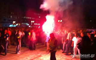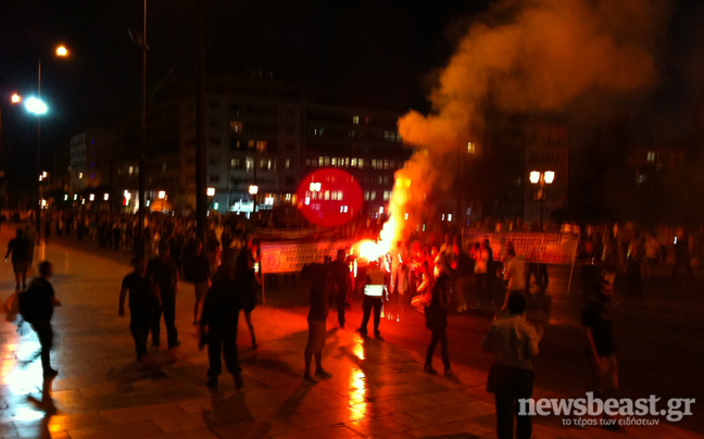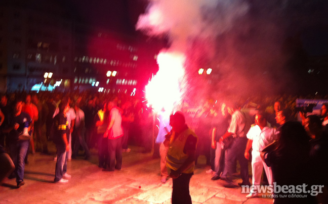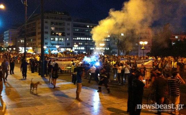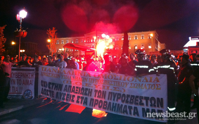 Επίσης, στην κεφαλή της πορείας βρέθηκαν πυροσβέστες που άναψαν καπνογόνα.