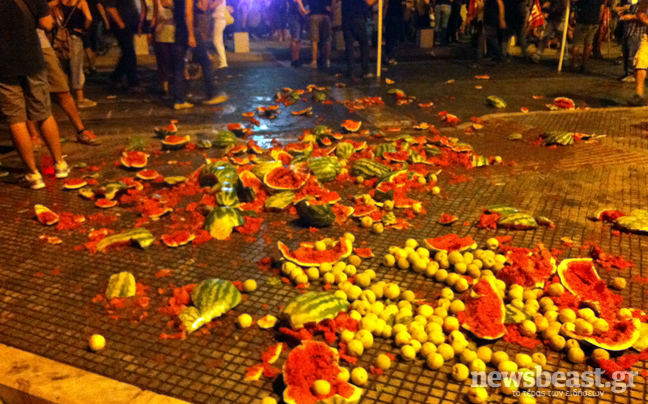 Νωρίτερα, μέλη αγροτικών συνεταιρισμών πέταξαν καρπούζια και άλλα φρούτα, στην είσοδο της ΔΕΘ, σε ένδειξη διαμαρτυρίας, ενώ μέλη της ΑΝΤΑΡΣΥΑ έκαψαν μία σημαία της Ε.Ε.