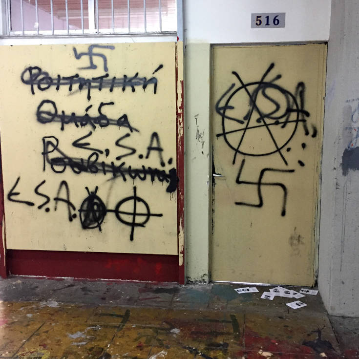 Στόχος επίθεσης νεοναζιστών έγινε το στέκι του Ρουβίκωνα στη Φιλοσοφική. Άγνωστοι έσβησαν όσα είχαν γράψει τα μέλη της αναρχικής ομάδας έξω από το γραφείο 516, καλύπτοντάς τα με σβάστικες και πετώντας τρικάκια με ακροδεξιό περιεχόμενο. Συγκεκριμένα την κίνηση υπογράφει η «Ελληνική Σοσιαλιστική Αντίσταση», η οποία στα φέιγ βολάν που πέταξαν έγραφε «κοιμάσαι Ρουβίκωνας, ξυπνάς ΣΥΡΙΖΑ».