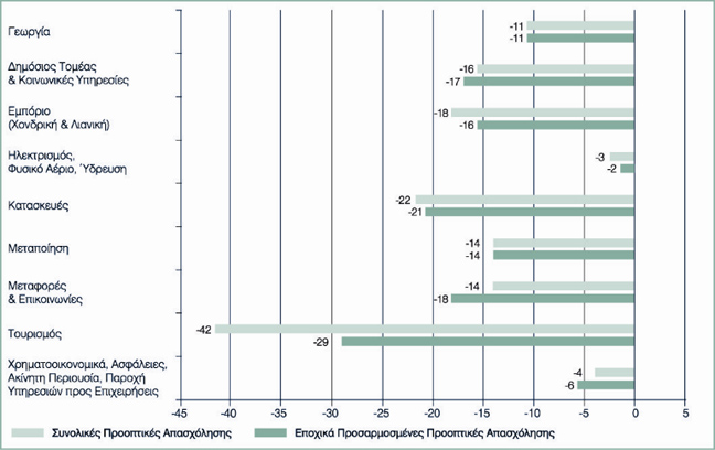 Οι εργοδότες και στους εννέα τομείς οικονομικής δραστηριότητας προβλέπουν μείωση του αριθμού των απασχολούμενων κατά τους επόμενους τρεις μήνες. Οι δυσμενέστερες προοπτικές αναφέρονται στον τομέα του Τουρισμού, όπου οι Συνολικές Προοπτικές Απασχόλησης ανέρχονται στο -29%, και στον τομέα των Κατασκευών, με Προοπτικές της τάξης του -21%. Δυσοίωνο είναι το κλίμα στον τομέα των Μεταφορών & Επικοινωνιών και στον τομέα Δημόσιο & Κοινωνικές Υπηρεσίες, όπου οι Προοπτικές καταγράφονται στο -18% και -17% αντίστοιχα. Οι Προοπτικές στον τομέα Χονδρικού & Λιανικού Εμπορίου ανέρχονται σε -16% και στον τομέα της Μεταποίησης σε -14%.