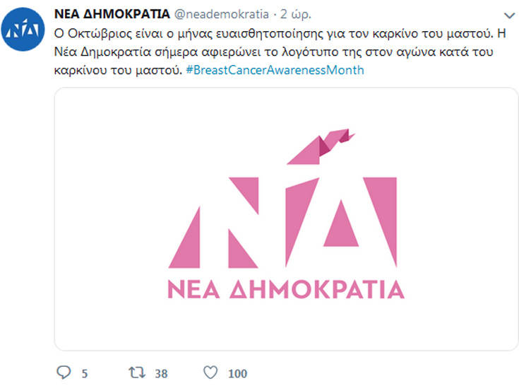 Το νέο σήμα της Νέας Δημοκρατίας βάφτηκε… ροζ για καλό σκοπό. Λίγο διάστημα μετά τα αποκαλυπτήρια του νέου του σήματος, το κόμμα της αξιωματικής αντιπολίτευσης προχώρησε σε μία προσωρινή αλλαγή. Το σήμα βάφτηκε ροζ με σκοπό να στηρίξει την καμπάνια ευαισθητοποίησης για τον καρκίνο του μαστού. Να σημειωθεί πως ο Οκτώβριος είναι ο μήνας ευαισθητοποίησης επί του θέματος. Σε ανάρτησή του στο twitter το κόμμα αναφέρει πως «η Νέα Δημοκρατία ήμερα αφιερώνει το λογότυπο της στον αγώνα κατά του καρκίνου του μαστού».