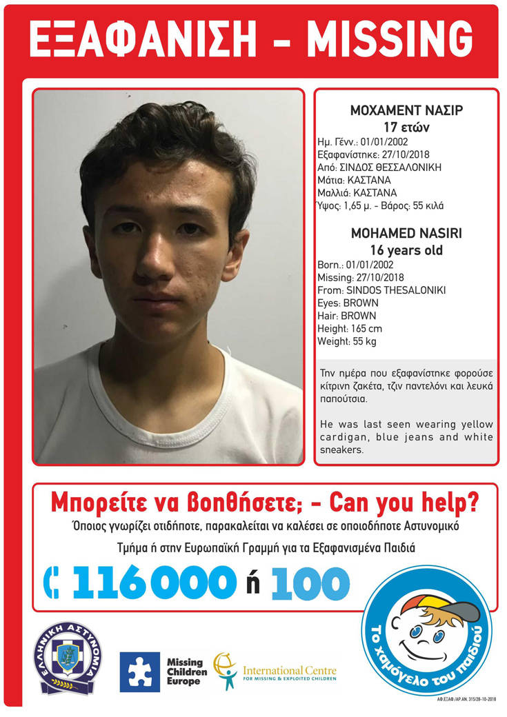 Ο 17χρονος Μοχάμεντ Νασίρι, αφγανικής καταγωγής, εξαφανίστηκε στις 27 Οκτωβρίου και ώρα 18:00 από τη Σίνδο Θεσσαλονίκης. Για την εξαφάνιση αυτή, «Το Χαμόγελο του Παιδιού» ενημερώθηκε στις 28 Οκτωβρίου, απογευματινές ώρες, και προέβη στη δημοσιοποίηση των στοιχείων του κατόπιν εισαγγελικής εντολής. Ο Μοχάμεντ έχει καστανά μαλλιά, καστανά μάτια, έχει ύψος 1,65 μ. και ζυγίζει 55 κιλά. Την ημέρα που εξαφανίστηκε φορούσε κίτρινη ζακέτα, τζιν παντελόνι και άσπρα αθλητικά παπούτσια. Οποιοσδήποτε έχει κάποια πληροφορία, παρακαλείται να επικοινωνήσει τηλεφωνικά με «Το Χαμόγελο του Παιδιού» όλο το 24ωρο, στην «Ευρωπαϊκή Γραμμή για τα Εξαφανισμένα Παιδιά 116000» καθώς και σε όλα τα Αστυνομικά Τμήματα της χώρας. Λόγω ιδιαίτερων συνθηκών εξαφάνισης του Μοχάμεντ, καθώς συντρέχουν σοβαροί λόγοι υγείας, είναι σημαντικό να υπάρξει ιδιαίτερη προσοχή και παρατηρητικότητα, ώστε να εντοπιστεί το συντομότερο δυνατό ο ανήλικος.