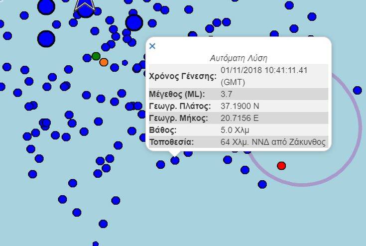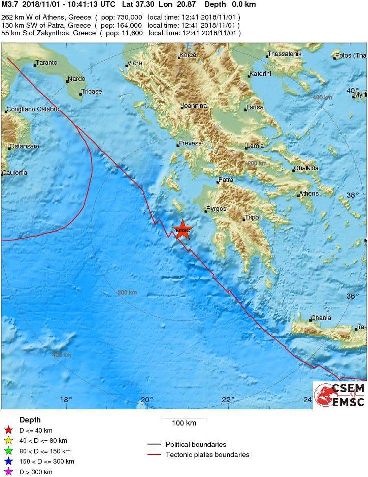 Εκ μέρους των τεσσάρων φορέων συγκρότησης του Εθνικού Σεισμολογικού Δικτύου, το Γεωδυναμικό Ινστιτούτο του Εθνικού Αστεροσκοπείου Αθηνών ανακοινώνει ότι σήμερα στις 12:41 ώρα Ελλάδος, οι σεισμογράφοι τους κατέγραψαν ασθενή σεισμική δόνηση, με μέγεθος 3,7 βαθμών της κλίμακας Ρίχτερ, που προέρχεται από απόσταση 292 χλμ. δυτικά νοτιοδυτικά της Αθήνας. Το επίκεντρο της δόνησης εντοπίζεται στο θαλάσσιο χώρο 64 χλμ. νότια νοτιοδυτικά της Ζακύνθου.