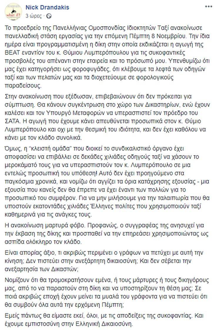 Κορυφώνεται η κόντρα ανάμεσα στην Πανελλήνια Ομοσπονδία Ιδιοκτητών Ταξί και την εφαρμογή Beat, μετά την προκήρυξη στάσης εργασίας για την Πέμπτη. Παράλληλα, ο πρόεδρος της ομοσπονδίας, Θύμιος Λυμπερόπουλος, κάλεσε σε συγκέντρωση διαμαρτυρίας έξω από τα Δικαστήρια της οδού Ευελπίδων στις 9 το πρωί της ίδιας ημέρας, όπου θα εκδικαστεί η αγωγή της Beat κατά του του προέδρου του ΣΑΤΑ, ο οποίος είχε καταγγείλει την εταιρεία για φοροδιαφυγή. Η ΠΟΕΙΑΤΑ ζητά την άμεση εφαρμογή του Ν.4530/18 και Ν.4446/16 και δράση από τις ελεγκτικές αρχές, για να δημιουργηθούν, όπως υποστηρίζει, συνθήκες υγιούς ανταγωνισμού, άμεση πάταξη της υποκλοπής έργου από φορείς (Ι.Χ.) που δεν έχουν δικαίωμα επιβατικής μεταφοράς, άμεση προσαρμογή όλων των εταιρειών διαμεσολάβησης με το εθνικό νομοθετικό πλαίσιο που διέπει την αστική μεταφορά. Η απάντηση ήρθε από τον ιδρυτή της Beat, Νίκος Δρανδάκη, ο οποίος σε ανάρτησή του στο Facebook τονίζει, μεταξύ άλλων: «Νομίζουν ότι θα τρομοκρατήσουν εμένα, ή τους μάρτυρες ή τους δικηγόρους μας, από το να παραστούν στη δίκη και να υποστηρίξουν τη θέση μας; Σε ποιά ακριβώς εποχή έχουν μείνει τα μυαλά του γράφοντα για να πιστεύει ότι θα συμβούν όλα αυτά την ερχόμενη Πέμπτη;». Ολόκληρη η ανάρτηση του Δρανδάκη: «Το προεδρείο της Πανελλήνιας Oμοσπονδίας Iδιοκτητών Tαξί ανακοίνωσε πανελλαδική στάση εργασίας για την επόμενη Πέμπτη 8 Νοεμβρίου. Την ίδια ημέρα είναι προγραμματισμένη η δίκη στην οποία εκδικάζεται η αγωγή της BEAT εναντίον του κ. Θύμιου Λυμπερόπουλου για τις συκοφαντικές προσβολές του απέναντι στην εταιρεία και το πρόσωπό μου. Υπενθυμίζω ότι μας έχει κατηγορήσει ως φοροφυγάδες, ότι κλέβουμε τα λεφτά των οδηγών ταξί και των πελατών μας και τα διοχετεύουμε σε φορολογικούς παραδείσους. Στην ανακοίνωση που εξέδωσαν, επιβεβαιώνουν ότι δεν πρόκειται για σύμπτωση. Θα κάνουν συγκέντρωση στο χώρο των Δικαστηρίων, ενώ έχουν καλέσει και τον Υπουργό Μεταφορών να υπερασπιστεί τον πρόεδρο του ΣΑΤΑ. Η αγωγή που έχουμε κάνει απευθύνεται προσωπικά στον κ. Θύμιο Λυμπερόπουλο και οχι με την θεσμική του ιδιότητα, και δεν έχει καθόλου να κάνει με τον κλάδο συνολικά. Όμως, η “κλειστή ομάδα” που διοικεί το συνδικαλιστικό όργανο έχει αποφασίσει να επιβάλλει σε δεκάδες χιλιάδες οδηγούς ταξί να χάσουν το μεροκάματό τους για να υπερασπιστούν τον κ. Λυμπερόπουλο σε μια εντελώς προσωπική του υπόθεση! Αυτό δεν έχει προηγούμενο στα παγκόσμια χρονικά, και νομίζω ότι αγγίζει τα όρια κατάχρησης εξουσίας – μια εξουσία που κανείς δεν θα έπρεπε να έχει έναντι των πολλών για το προσωπικό του συμφέρον. Για να μην μιλήσουμε για την ταλαιπωρία που θα υποστούν εκατοντάδες χιλιάδες Έλληνες πολίτες που χρησιμοποιούν ταξί καθημερινά για τις ανάγκες τους. Η ανακοίνωση μαρτυρά φόβο. Προφανώς, ο συγγραφέας της ανησυχεί για την έκβαση της δίκης και προσπαθεί να την επηρεάσει χρησιμοποιώντας ως ασπίδα ολόκληρο τον κλάδο. Είναι απορίας άξιο, τι ακριβώς περιμένει ο γράφων να πετύχει με αυτή την κίνηση; Δεν πιστεύει στην ανεξάρτητη δικαιοσύνη; Και δεν σέβεται την ανεξαρτησία των Δικαστών; Νομίζουν ότι θα τρομοκρατήσουν εμένα, ή τους μάρτυρες ή τους δικηγόρους μας, από το να παραστούν στη δίκη και να υποστηρίξουν τη θέση μας; Σε ποιά ακριβώς εποχή έχουν μείνει τα μυαλά του γράφοντα για να πιστεύει ότι θα συμβούν όλα αυτά την ερχόμενη Πέμπτη; Εμείς πάντως θα είμαστε εκεί, όλοι, με τις αποδείξ