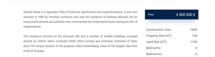 «Μόλις μπείτε στο αρχοντικό και στο κύριο σαλόνι, αισθάνεστε αμέσως το σταυροδρόμι των πολιτισμών και των χρωμάτων. Εδώ το παρελθόν και το παρόν ζουν μαζί και αρμονικά. Αφήστε τις αισθήσεις σας να είναι ο οδηγός σας στην περιήγησή σας σ’ αυτή την εκλεπτυσμένη ιστορική κατοικία», αναφέρεται μεταξύ άλλων στην ιστοσελίδα.