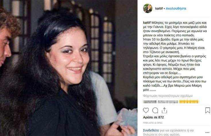 Δύσκολες ώρες περνάει η Καίτη Φίνου. Η ηθοποιός έχασε την αγαπημένη της αδελφή μετά από ανακοπή. Τη θλιβερή είδηση έκανε γνωστή μέσω Instagram η ίδια η ηθοποιός, η οποία αποκάλυψε πως η αδερφή της Μαίρη έπαθε χθες το βράδυ ανακοπή καρδιάς και τελικά έφυγε από τη ζωή σήμερα το πρωί. Αναλυτικά η ανάρτησή της Καίτης Φίνου: «Μίλησες το μεσημέρι και μαζί μου και με την Γιάννα. Είχες λίγο πονοκέφαλο αλλά ήταν συνηθισμένο. Περίμενες με αγωνία να μπουν οι νέοι παίκτες στο nomads. Ήταν 10 το βράδυ. Είμαι με την άλλη μας την αδελφή Και μιλάμε. Χτυπάει το τηλέφωνο. Ο γαμπρός μου. Η Μαίρη είναι στο Τζάνειο με ανακοπή. Έτρεξα και μόλις έφτασα βγαίνει ο γιατρός και μας λέει πως μέχρι το πρωί θα έχεις φύγει. Κι έφυγες. Νόμιζα πως ήταν ένα κακόγουστο αστείο. Μέχρι που μας επέτρεψαν να σε δούμε…. Καρδιά μου αδελφή μου αγαπημένο μου πλάσμα πως να πω αντίο… Πώς να σου πω καλό ταξίδι….. Αχ βρε Μαριώ μου Μαίρη μου ………».