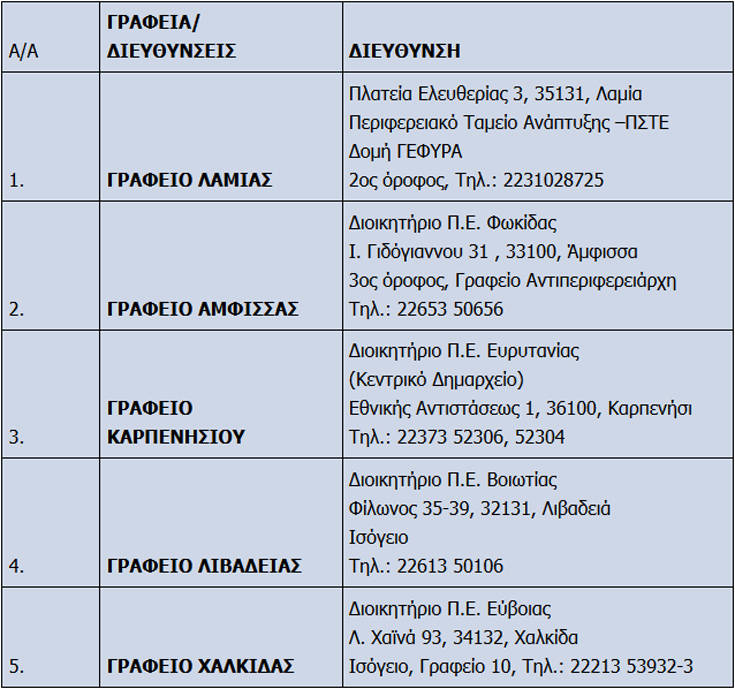 Οι ενδιαφερόμενοι μπορούν να ενημερωθούν από την ιστοσελίδα της Γέφυρας www.gefyra.com.gr και της Περιφέρειας Στερεάς Ελλάδας www.pste.gov.gr αλλά να απευθύνονται και στα παρακάτω γραφεία: