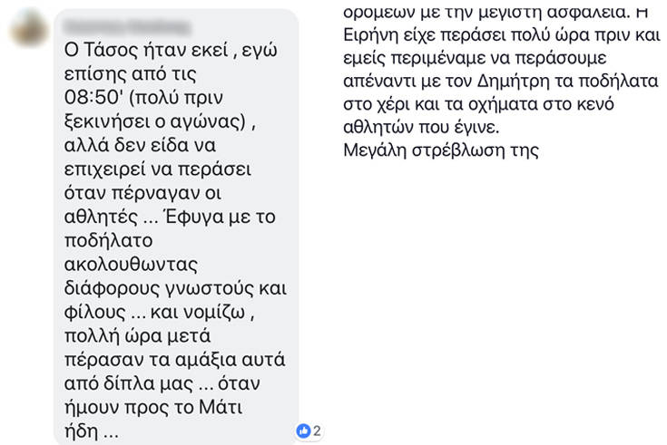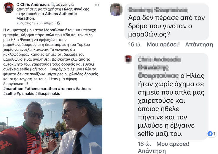 Μάλιστα, ο κ. Ψινάκης έχει ανεβάσει στον προσωπικό του λογαριασμό στο Facebook σχόλια δρομέων και ανθρώπων που βρέθηκαν εκεί και αναφέρονται στην παρουσία του στον μαραθώνιο, επιβεβαιώνοντας τα όσα υποστηρίζει ο δήμαρχος Μαραθώνα.