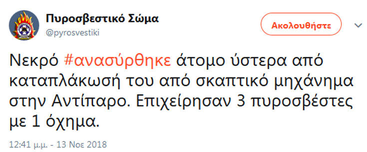 Νεκρός ανασύρθηκε από σκαπτικό μηχάνημα ένας άτυχος άνδρας στην Αντίπαρο.