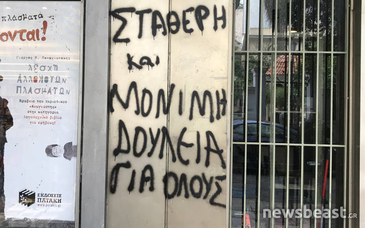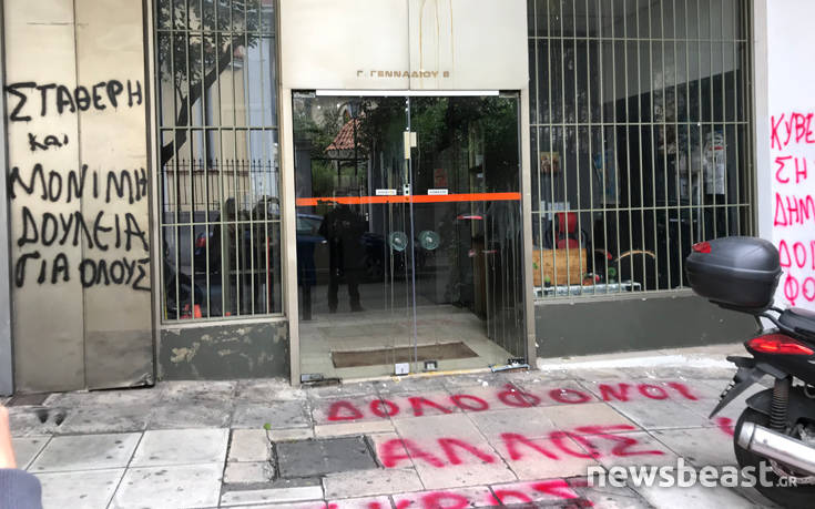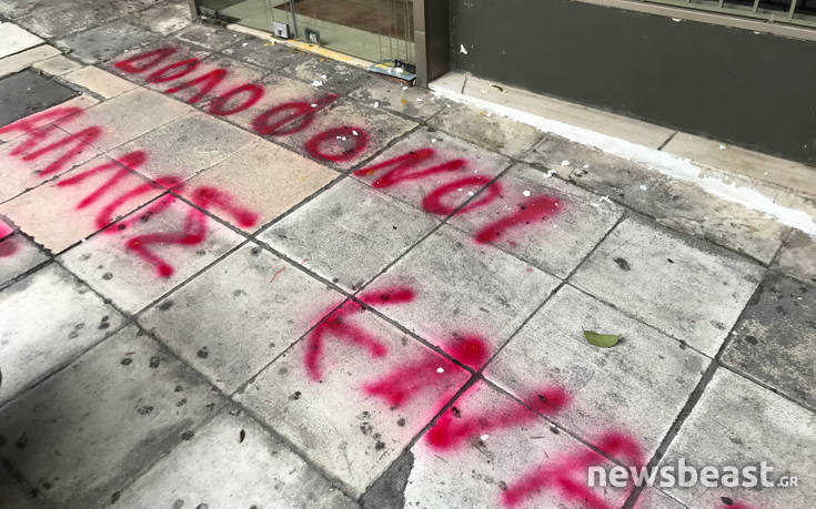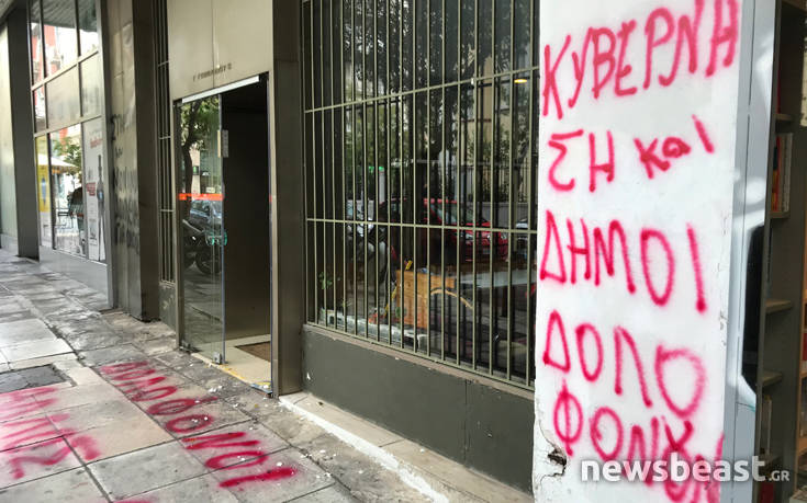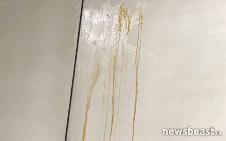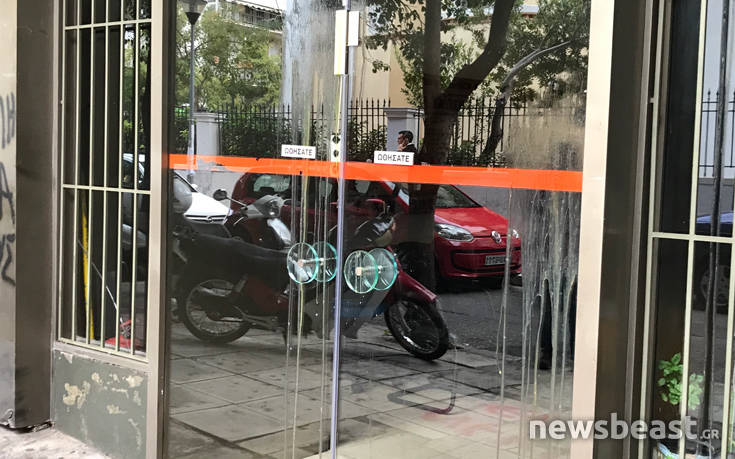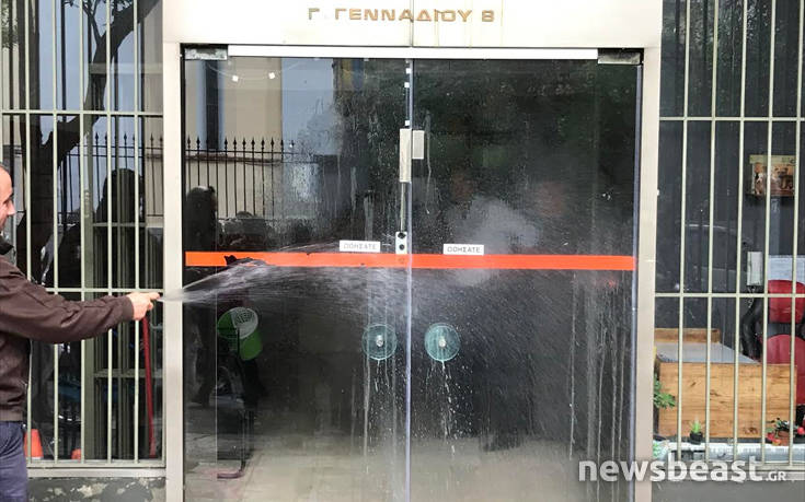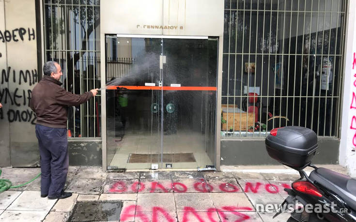 Στη συνέχεια πάντως οι εργαζόμενοι καθάρισαν με νερό την πρόσοψη του κτιρίου.