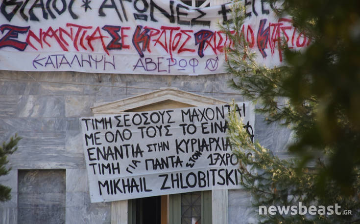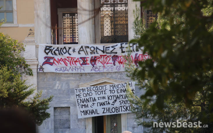 Το κεντρικό κτίριο Αβέρωφ βρίσκεται υπό κατάληψη από αντιεξουσιαστές, ενώ στον προαύλιο χώρο είναι εμφανής η παρουσία της περιφρούρησης της σχολής, που αποτελείται από μέλη της φοιτητικής οργάνωσης του ΚΚΕ.