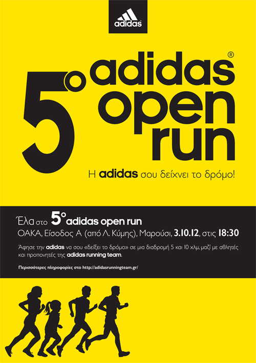 Αν και για σένα το τρέξιμο είναι κάτι παραπάνω από προπόνηση, αν θες να διασκεδάσεις τρέχοντας ή αν θες να ξαναζήσεις μια ακόμα adidas Open Run εμπειρία, έλα στο 5ο adidas Open Run, στις 3 Οκτωβρίου και ώρα 18:30, στο OAKA (Είσοδος Α’ από Λεωφ. Κύμης)!